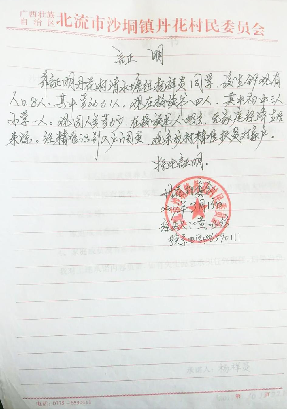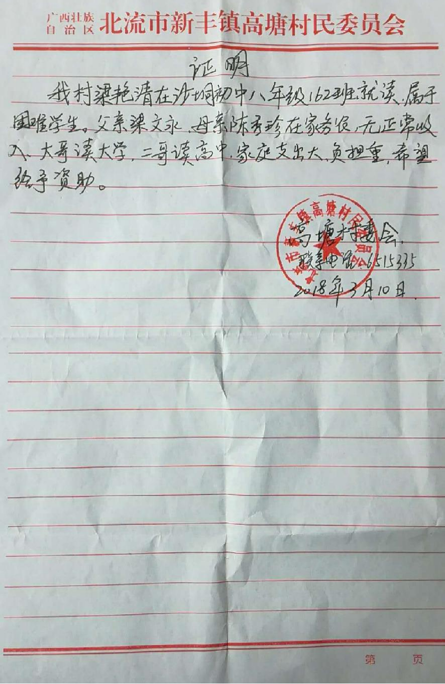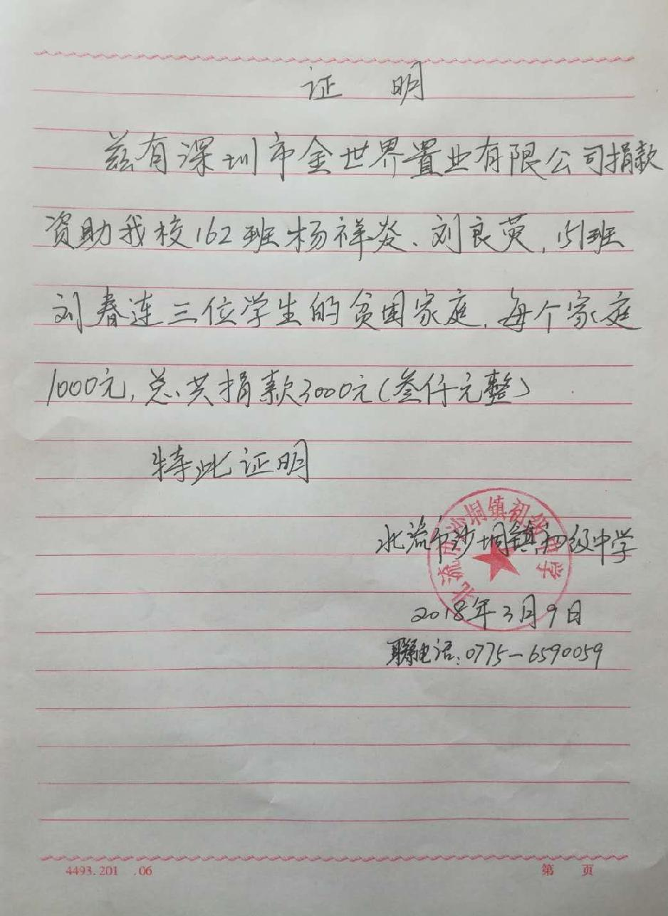 北流市沙垌镇初级中学-贫困学生及贫困家庭的捐款(附村委会证明及学生感谢信)【人民币6000元】 |