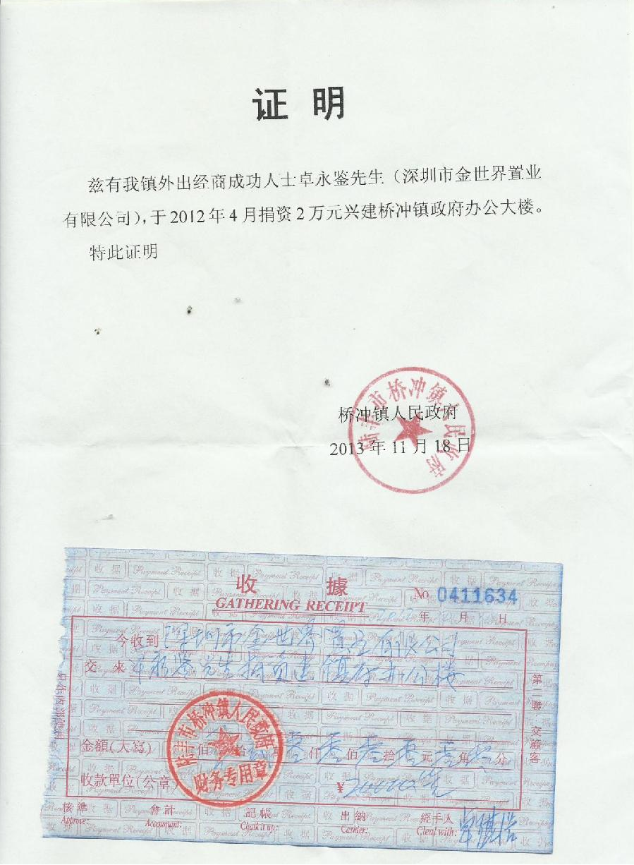 兴建桥冲镇政府办公大楼社会公益证明【20000元】 |