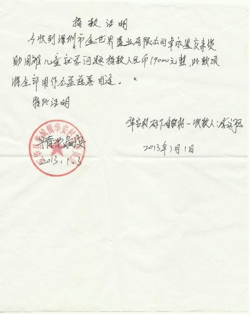 五华县华城镇华安村民委员会-资助困难儿童就学问题社会公益捐款证明